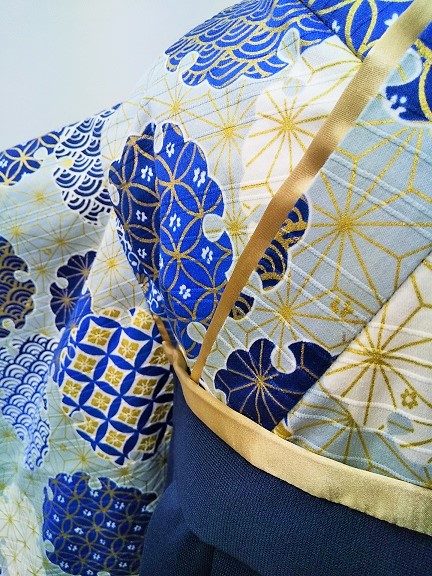 東京都H.T様 ご注文品(着物風カバーオール)≪麻の葉に金彩雪輪(くすみ水色)×紺≫