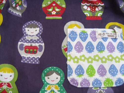 大きなマトリョーシカちゃんとイチゴが個性的なスモックです。